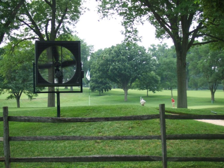 2. It’s to keep the greens from burning out in the summer. I’ve seen these on a few other courses in town. Ironhorse, I think… Anyway, if a green doesn’t have a lot of tree coverage, it will burn out from all the sun. Seems like Indian Hills (and my yard…) always loses some tress in the winter, so there are some spots that just don’t get any shade. Fairways and tee boxes take their share of abuse, and are pretty durable. The grass on a green is a different story. So, the fans keep the air moving around the green, keeping them (somewhat) cooler. I don’t think they have anything to do with rain, because as the previous post said, a green shouldn’t be truly flat in the first place.