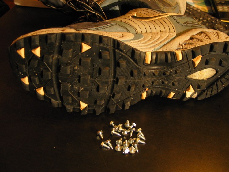 I’m pretty much a gear head, but for some reason I didn’t want to jump into the list of traction devices in my previos post. I opted for the roll-your-own, screw shoes option. This option has been professed for a while, but perhaps my less than young body has convinced me this is a good idea (read: I fell on my ass, and it hurt).