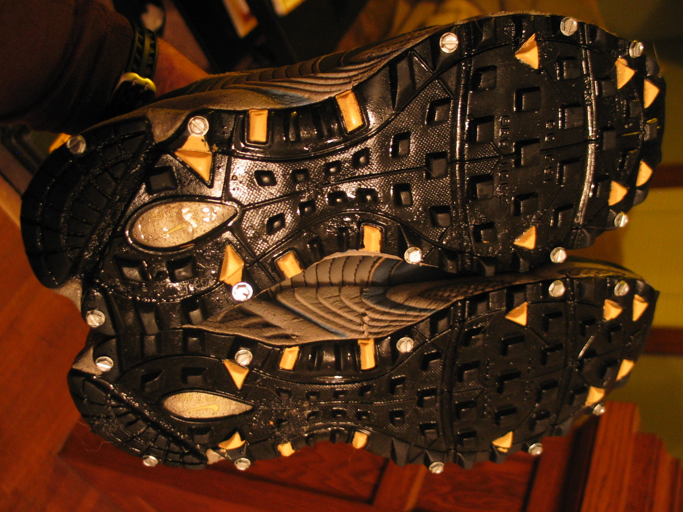 I ran to my local hardware store and grabbed twenty 3/8 inch hex head screws. Since these are Nike Air running shoes, I wanted to avoid deflating the marketing genius inside of my shoes. I kept the screws to the outside lugs of the shoes. While this isn’t the most optimal traction pattern, it does prevent me from repeating the backside impact that I really wish to avoid. The difference in grip is dramatic. It’s not like running on dry ground, but it lends much confidence to my footing. If I didn’t have the air pockets in my way, I would certainly add more screws to the mix. If not for the traction, just to look and sound a little more like a badass. Did I mention the unique crunch of metal on concrete this creates? It reminds me of cross country races when you had to cross the occasional section of pavement in racing spikes.