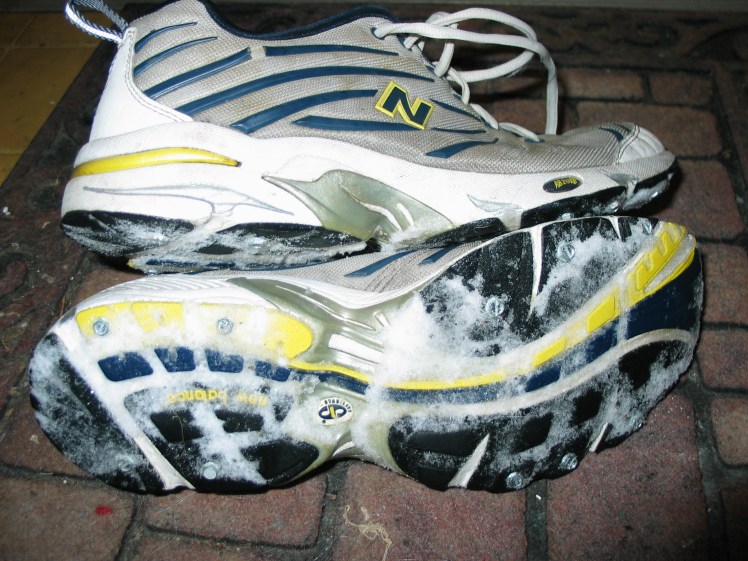 I have enjoyed the screw shoe experience to such an extent that I decided to toss them in another pair of shoes. I had an extra twenty 1/2 inch screws and put them to use in an old pair of New Balance. I think the half inchers are a little longer than necessary, so next time I’m at the hardware store, I’ll be picking up another twenty 3/8th inchers and loading up these winter runners.