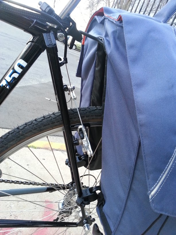 As I mentioned in my previous post, I picked up a Knog “The Boxer” rackless pannier system, but mostly with the intent to use it with a traditional rack. By removing the internal frame and threading a bungee through it, it worked well with a traditional rear rack. But recently I tried the rackless system, and found it less than satisfactory. In truth, I would say that there is no way that I could rightfully recommend this solution to anyone. I would say this thing is a safety hazard.