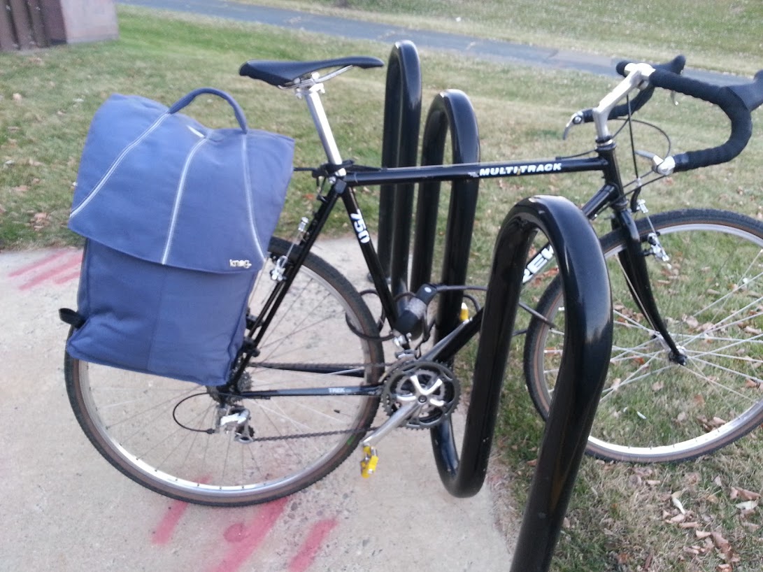 In the end you’ll have a nice set of panniers that ride securely on a sturdy rack. The panniers will come off of the bike easily, by unhooking some velcro and/or bungee cords.